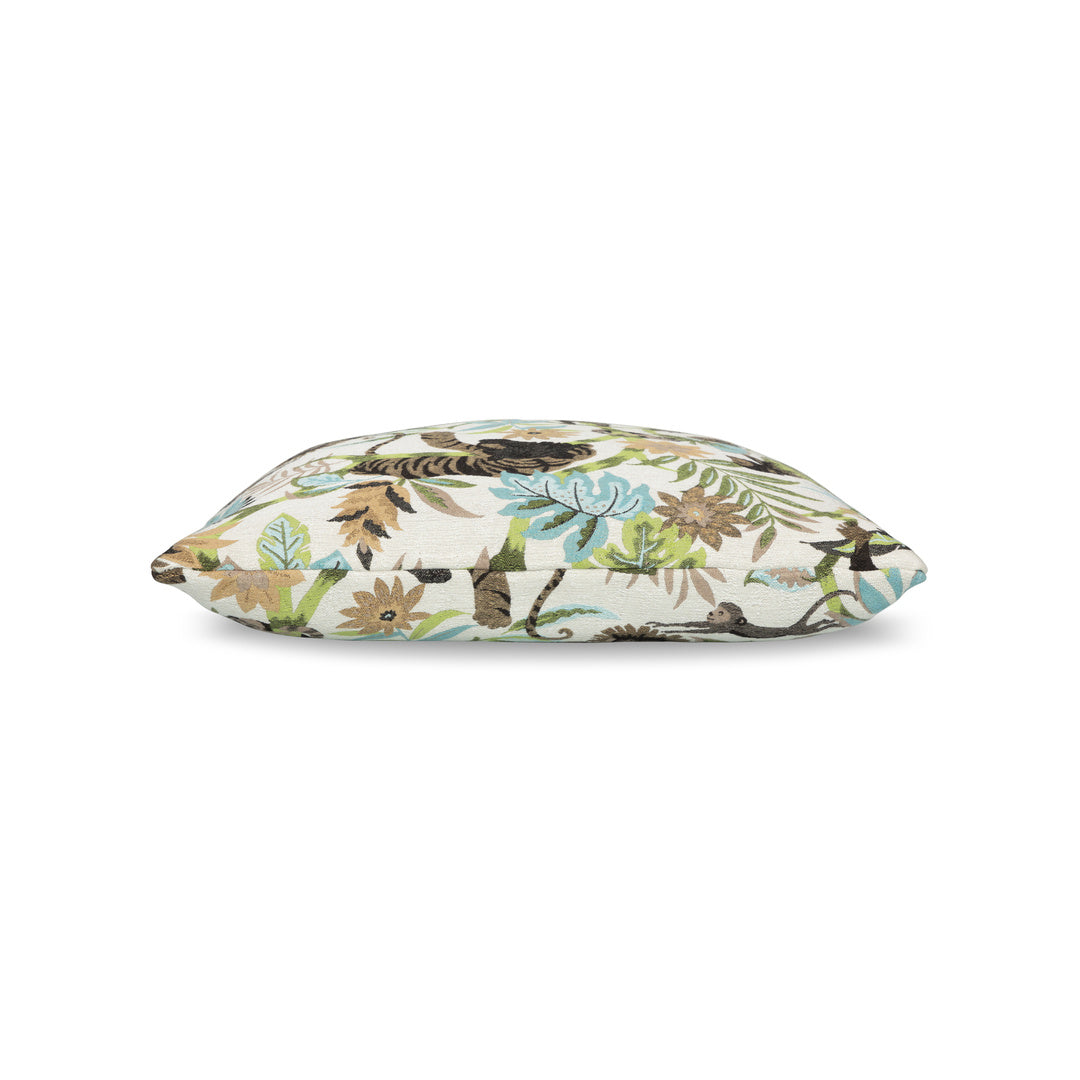 Playful primates swing through an embroidered canopy of stylized leaves and tropical blooms, rendered in this pillow's nuanced jacquard weave. The palette is softened just enough to let the pattern charm without overwhelming, striking a balance between the exuberant and the refined.