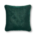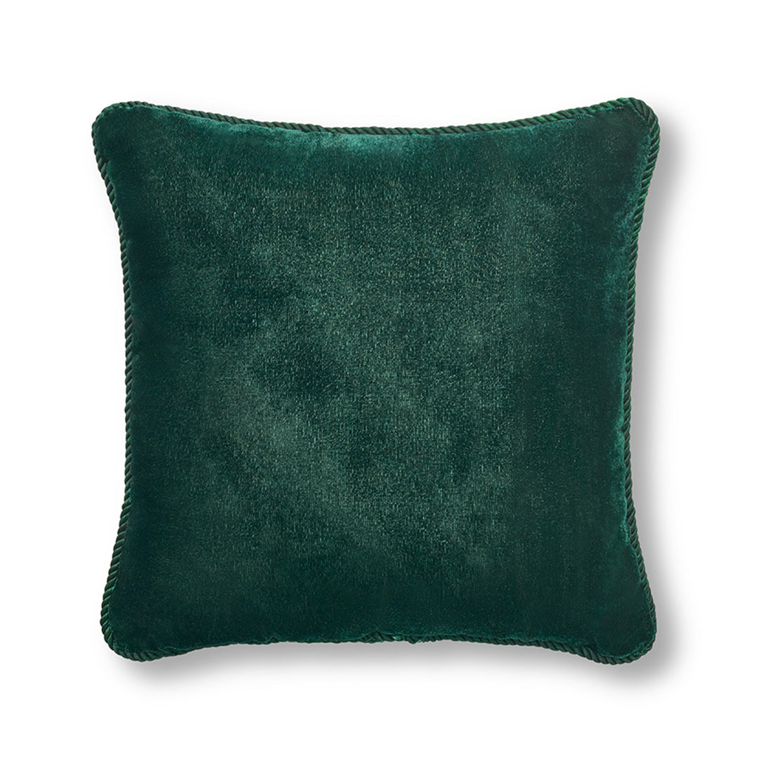 Our shimmering holiday pillow is an example of zardozi hand-embroidery, the ancient art of working with gold- and silver-tone threads. Handmade in India, it has a forest green luxe poly velvet background that appears in solid on the back.
