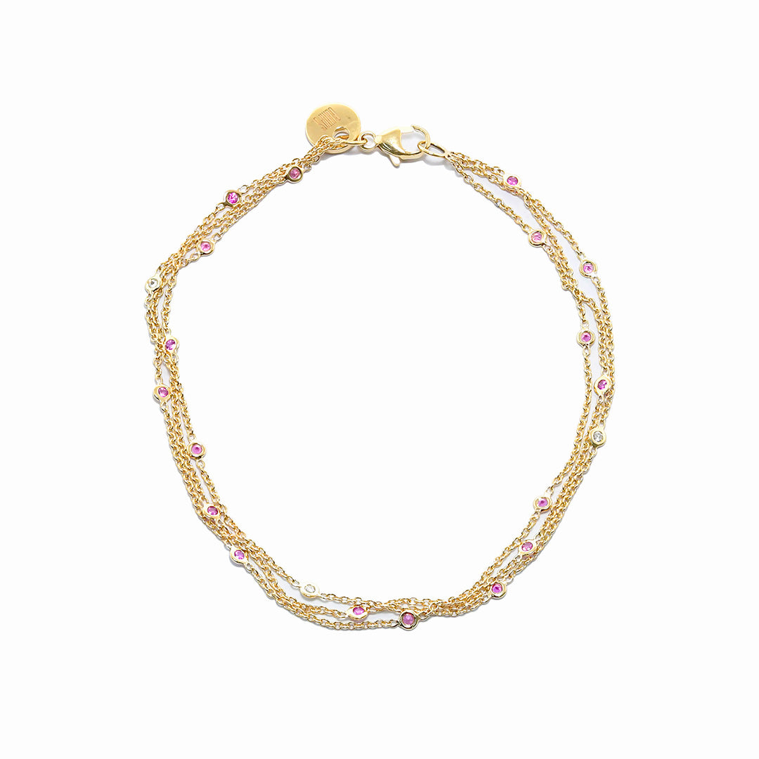 Our three-chain bracelet intertwines pink sapphires and diamonds, creating a stunning interplay of sparkle and vivid color that wraps the wrist in luxury.