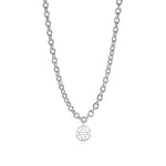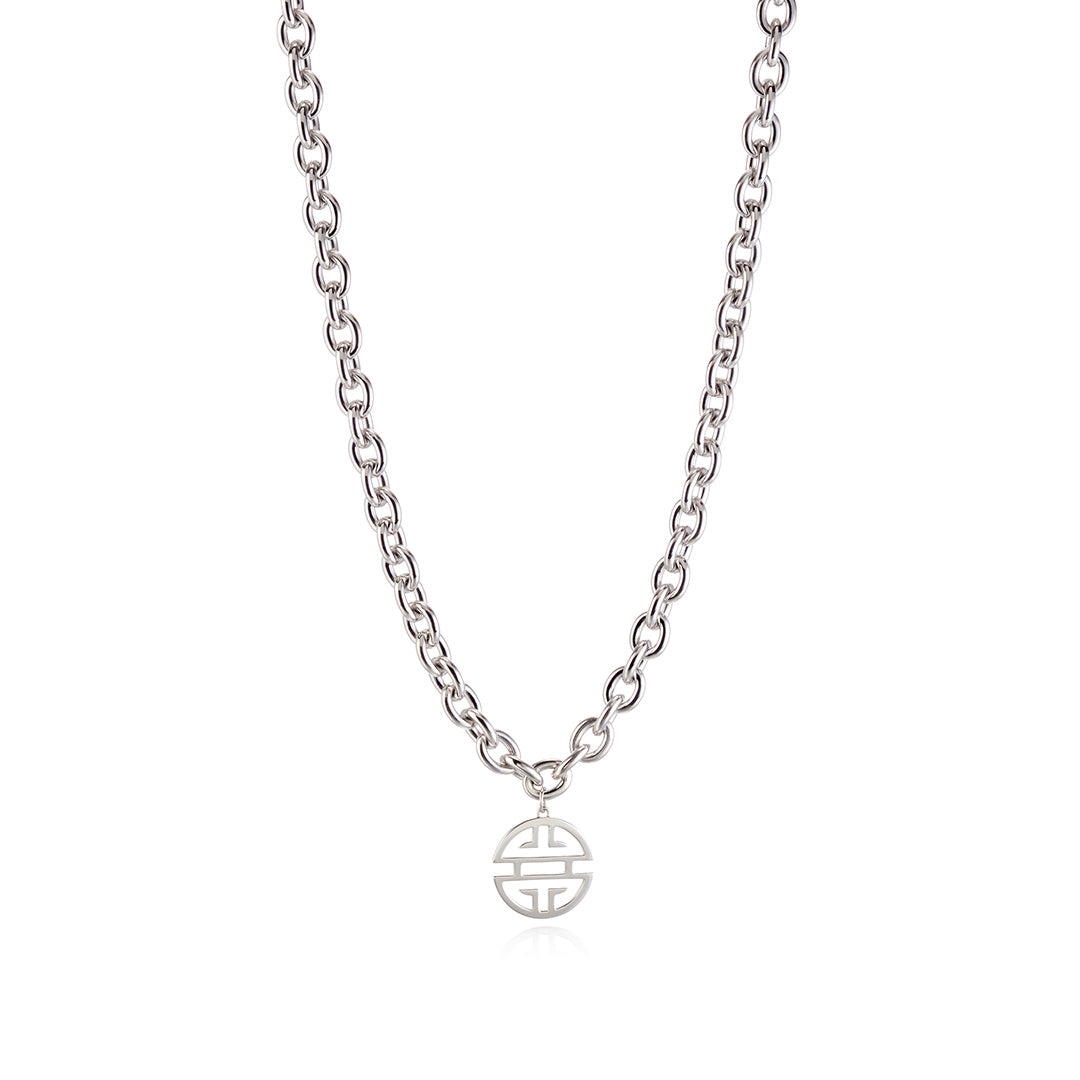 Hanging from a modern chunky sterling silver link necklace is a classic shou pendant, a signature symbol at Gump's that represents long life and prosperity.
