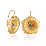 Golden morning glory blossoms open to reveal vivid hauyne centers, each framed by a delicate halo of diamonds. The sculpted petals add texture and depth, giving the earrings a striking yet organic presence.