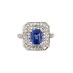 A stunning cocktail rain featuring a streamlined design that reflects the bold elegance of the 1920s. An emerald-cut sapphire sits at the center, framed by two crisp tiers of diamonds set in a squared silhouette, with additional diamonds along the shoulders.