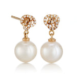 Lustrous freshwater pearls are suspended from intricate diamond-set knots, blending fluid form with ornate detail. The design brings together soft radiance and sculptural sparkle in a refined drop silhouette.