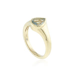 A serene pear-shaped aquamarine nestles into a smooth, sculpted gold bezel — clean-lined and fluid, like a single drop of water made luminous. A quietly striking silhouette with graceful presence.