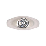 Streamlined and substantial, this gentleman’s gypsy ring centers a brilliant-cut diamond within a smooth, protective bezel of white gold.