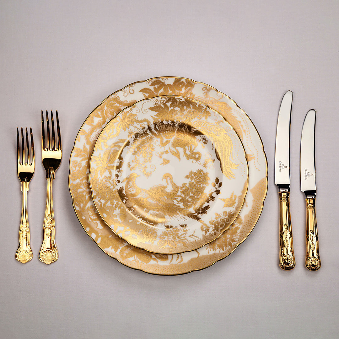 Crafted of white bone china, this stunning salad plate features a 22-karat yellow gold depiction of birds of paradise and peacocks adapted from an embroidery pattern by painter Albert Gregory. Established in 1750, Royal Crown Derby is renowned for the unrivaled quality of its tableware made exclusively in the U.K. 8" diam.