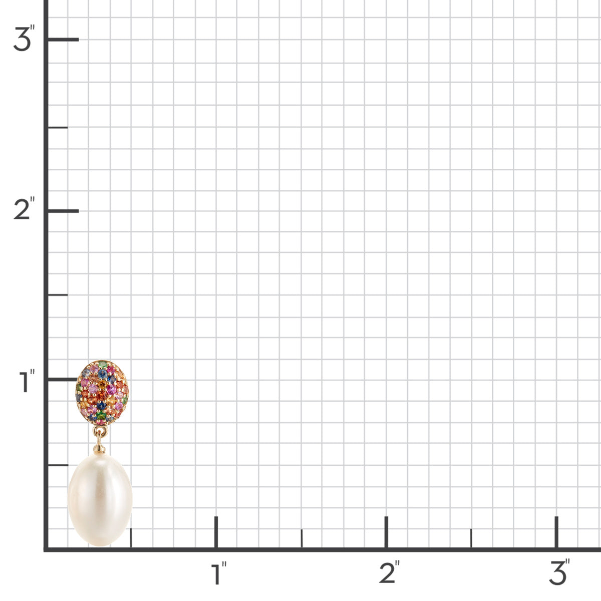 These earrings dazzle with a medley of multi-colored sapphires set above white baroque freshwater pearls, offering a vibrant flourish with each turn of the head. The playful array of colors contrasts beautifully with the smooth, natural luster of the pearls, presenting a piece that's both striking and refined.