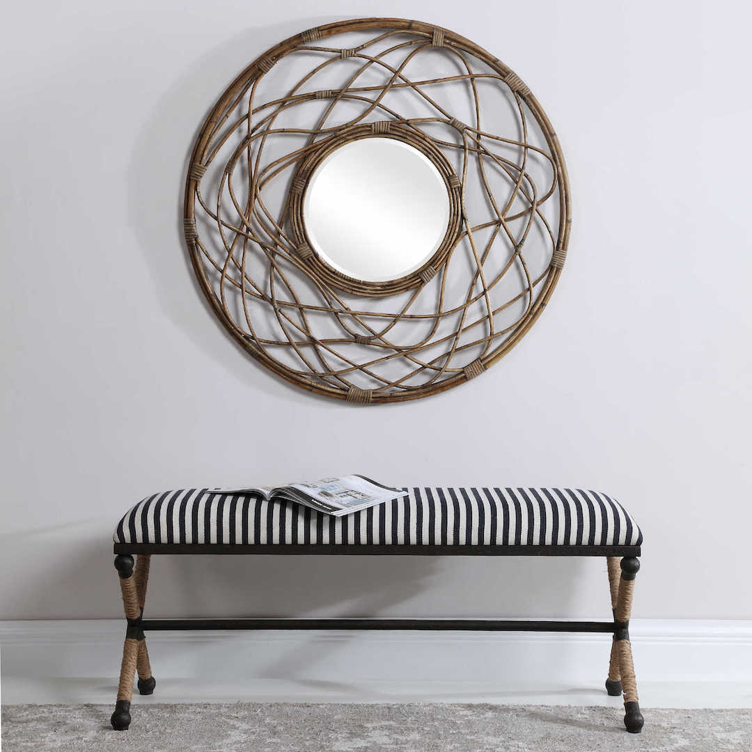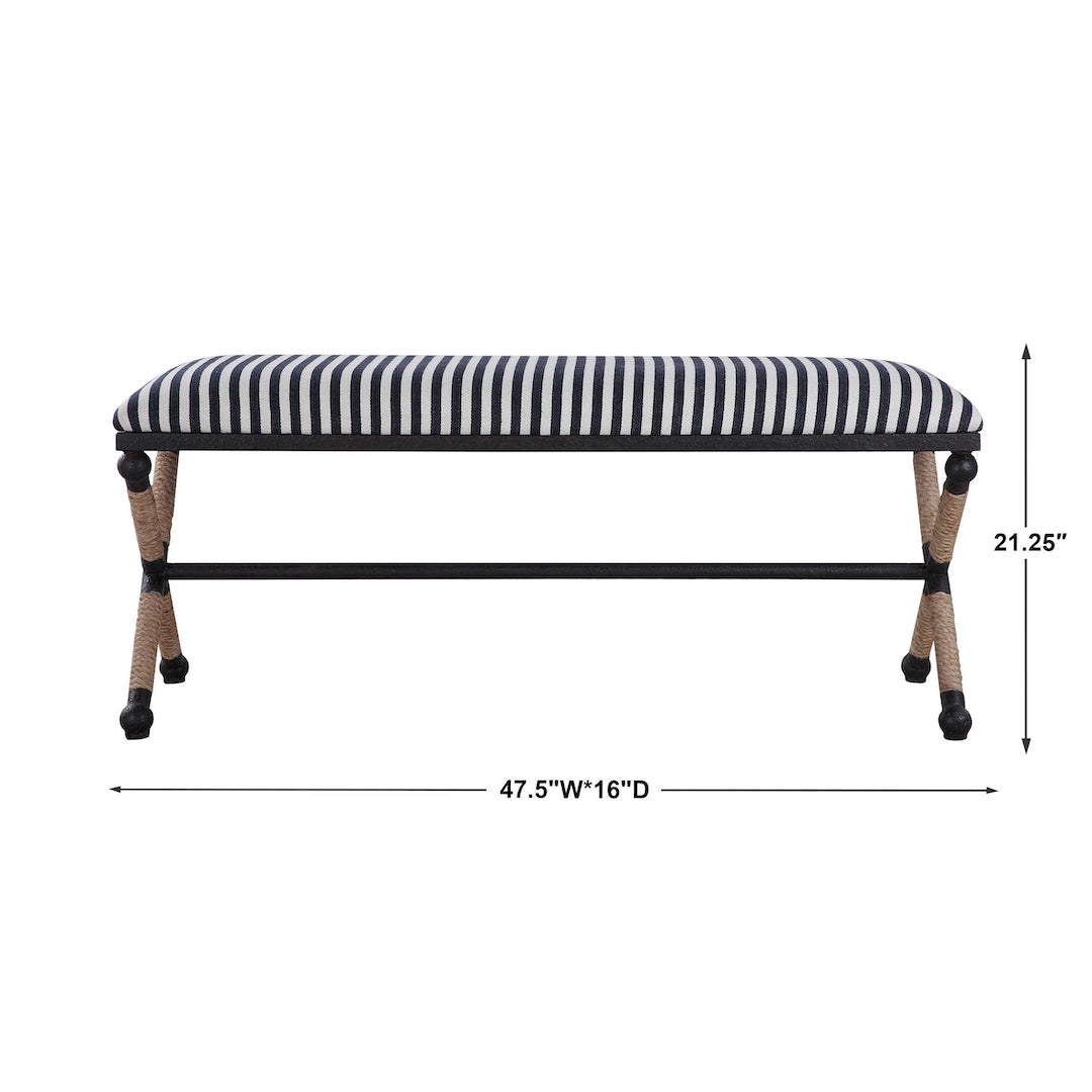 A refreshing coastal accent featuring rustic iron accented by a cushioned top in sailor-striped navy and cream cotton. Perfect at the foot of a bed or as an entryway bench.