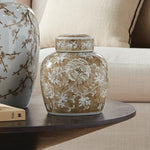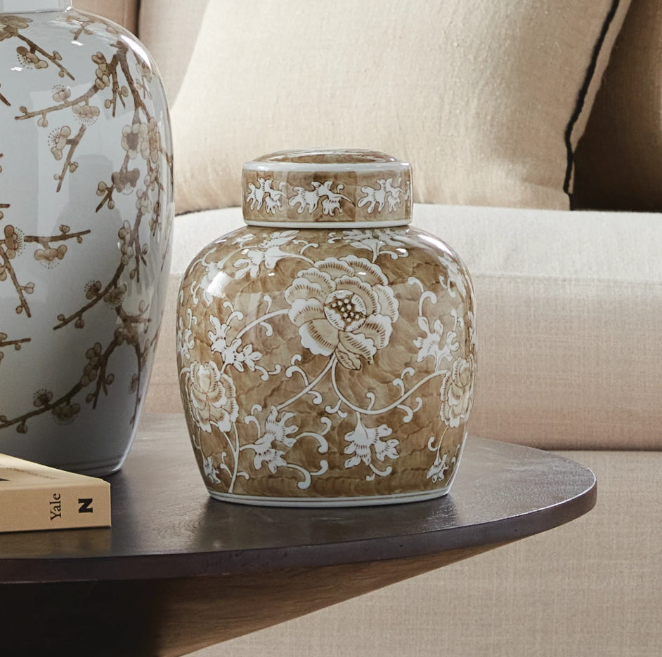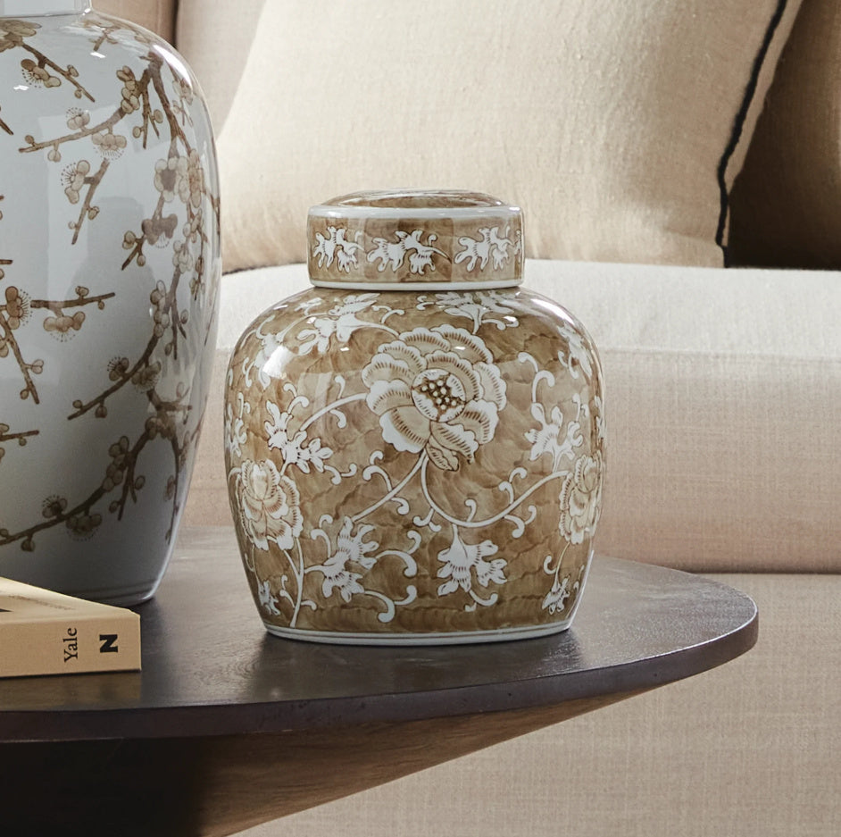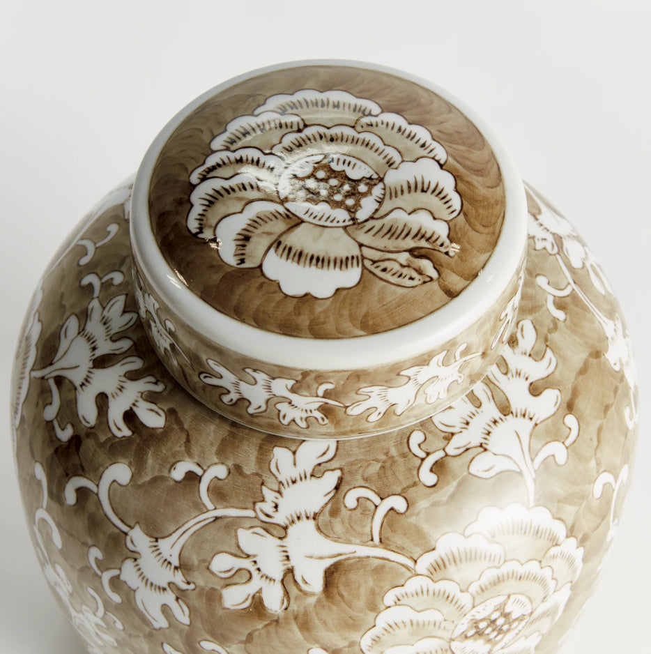 Sweeping florals and soft neutral tones give this hand-glazed jar a serene presence. Its delicately layered design draws the eye, making it a natural focal point in any refined space.