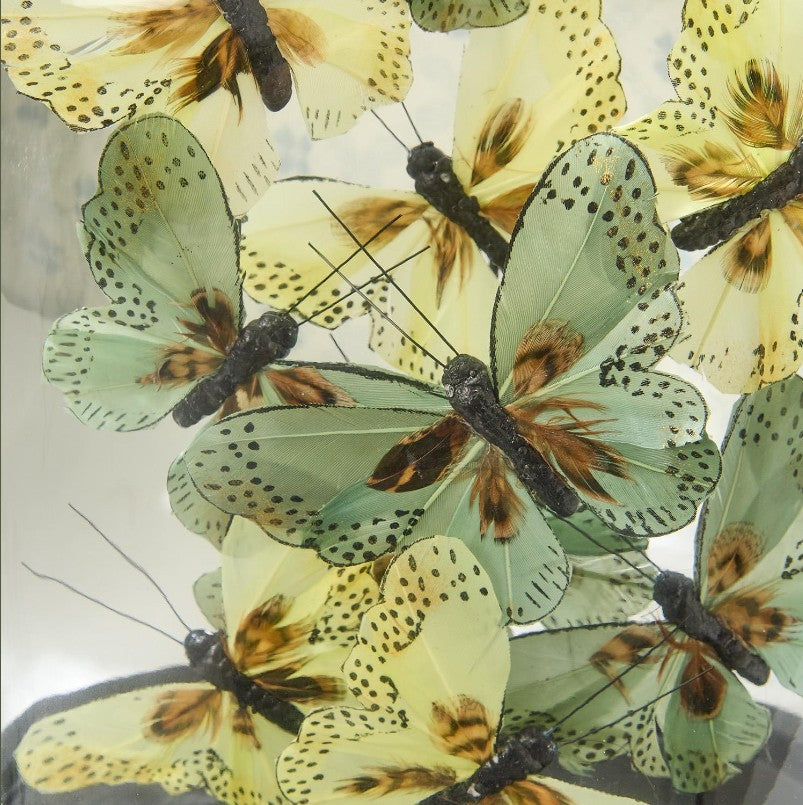 Inspired by a famous French taxidermy — home to a cabinet of curiosities that holds some of the most remarkable wonders of entomology — these artfully arranged butterflies are handcrafted with delicate feathers and intricate wire details. Displayed under a clear glass dome, the encased "specimens" sit atop a dark wood base.