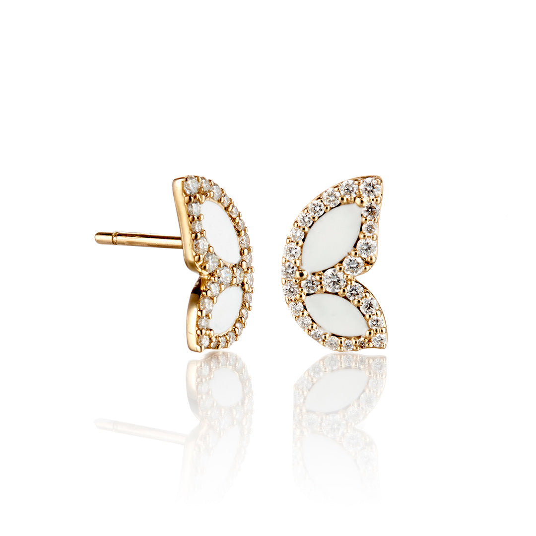 Delicate arcs of white enamel mimic a butterfly in mid-flight, edged in brilliant diamonds and set in yellow gold.