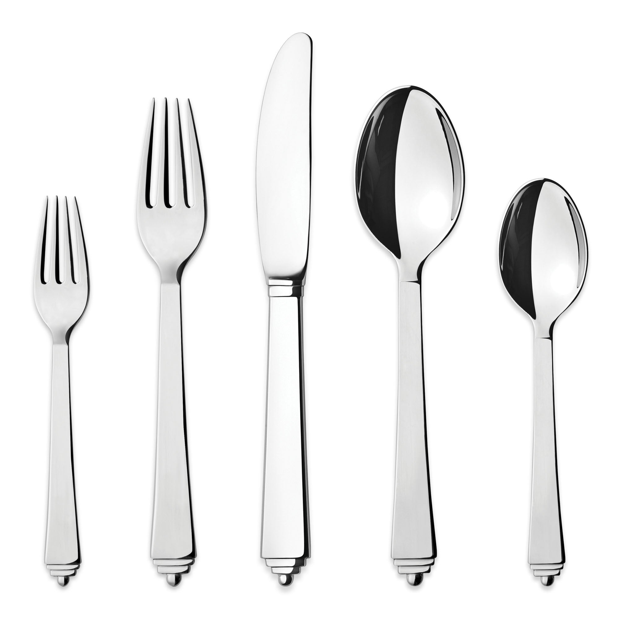 With its distinctive pyramid decoration at the base of each handle, this stainless-steel cutlery set hints to the sophisticated and timeless style of the Art Deco movement. The 5-piece set comprises of a dinner knife, dinner fork, dinner spoon, salad fork and teaspoon.