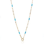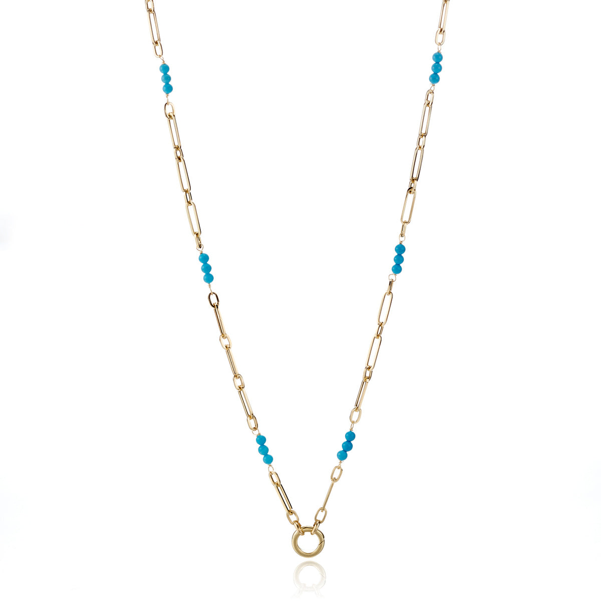 A balance of structure and fluidity, this necklace pairs elongated gold links with vibrant turquoise accents, offering both versatility and understated luxury. Whether adorned with charms or worn alone, its ring clasp serves as a focal point of effortless refinement.