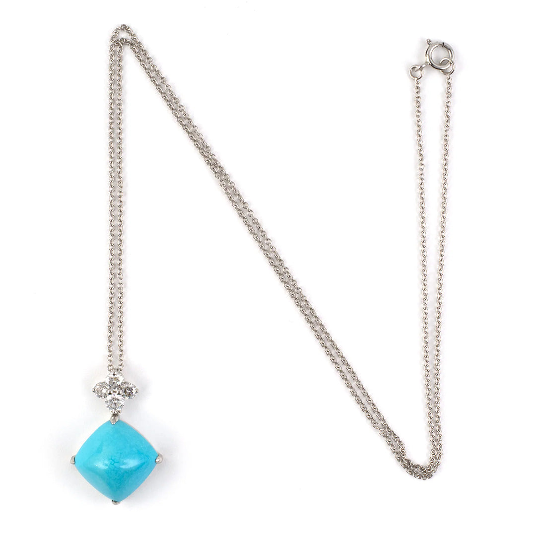 A striking balance of elegance and bold color, this platinum pendant necklace features a sugarloaf turquoise cabochon suspended beneath a quartet of brilliant diamonds. Gump’s is forever treasure hunting for the best of everything and our collection of estate jewelry — featuring rare antique pieces — is no exception. Distinguished in provenance, each item is one of a kind, reflecting its distinctive gemstones, materials and craftsmanship.