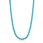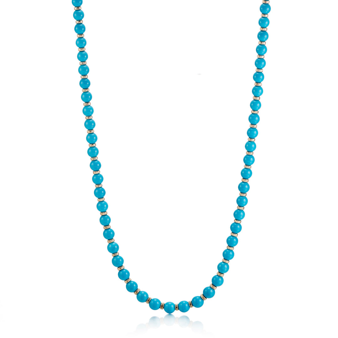Vibrant Sleeping Beauty turquoise beads are spaced with ridged gold rondels, highlighting the gemstone’s famed clarity and vivid sky-blue color. Mined in Arizona, this prized stone is cherished for its natural purity and protective energy.