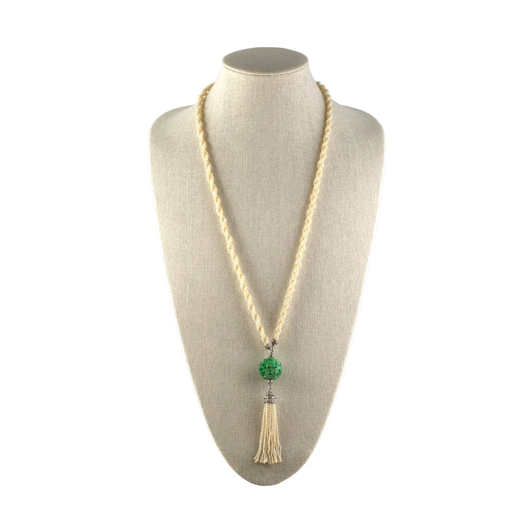 Suspended like a talisman, the hand-carved jadeite dragon ball anchors this Edwardian necklace with a sculptural gravity. Twisted strands of luminous seed pearls culminate in a platinum-tipped tassel, a delicate counterbalance to the bold centerpiece — blending East Asian artistry with early 20th-century European refinement. Gump’s is forever treasure hunting for the best of everything and our collection of estate jewelry — featuring rare antique pieces — is no exception. Distinguished in provenance, each item is one of a kind, reflecting its distinctive gemstones, materials and craftsmanship.