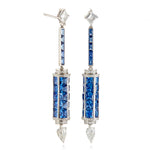 Geometric precision defines these earrings, where sapphires are channel-set into elongated barrel forms framed with diamonds. Diamonds in kite-shaped studs and suspended pear-shapes complete the design, adding a striking finish to the bold architectural silhouette.