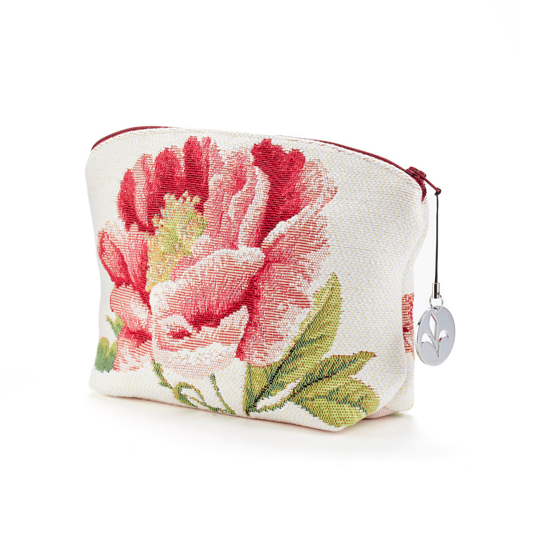Our lovely tapestry accessory bag has an intricate, jacquard-woven peony design, bringing texture to the brightly colored flower and allowing you to enjoy its beauty throughout the year. Perfectly sized to hold cosmetics, toiletries and jewelry, it's made from cotton, lined in fabric and detailed with a metal fleur-de-lys zipper pull.