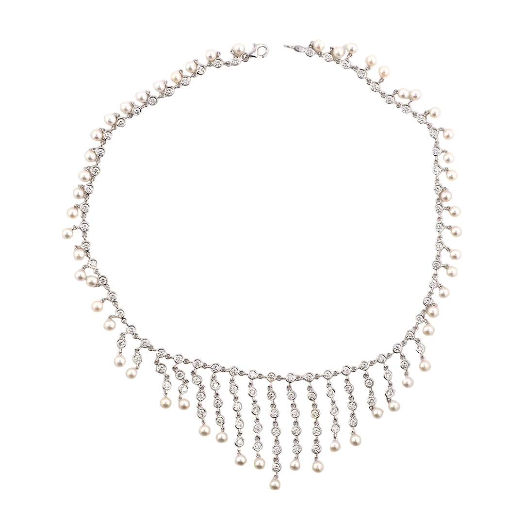 Crafted in white gold, this Italian festoon necklace features a fluid arrangement of bezel-set diamonds that give way to a graceful fringe of pearl drops. The diamond-by-the-yard setting lends an airy elegance, allowing each element to move with quiet sophistication.