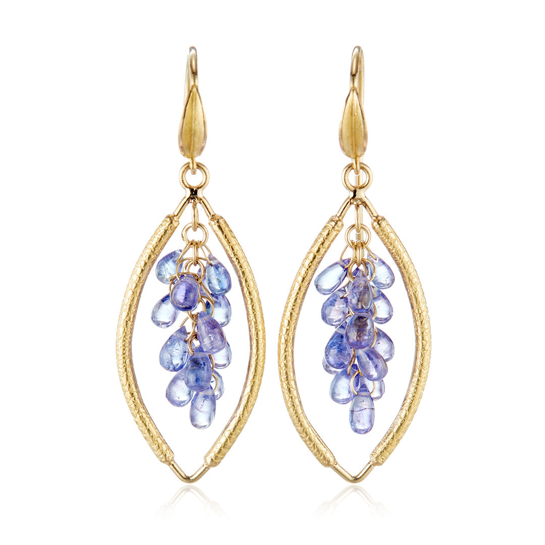 A waterfall of cascading tanzanite briolettes hangs within a gold open-shaped teardrop for maximum effect on these eye-catching earrings.