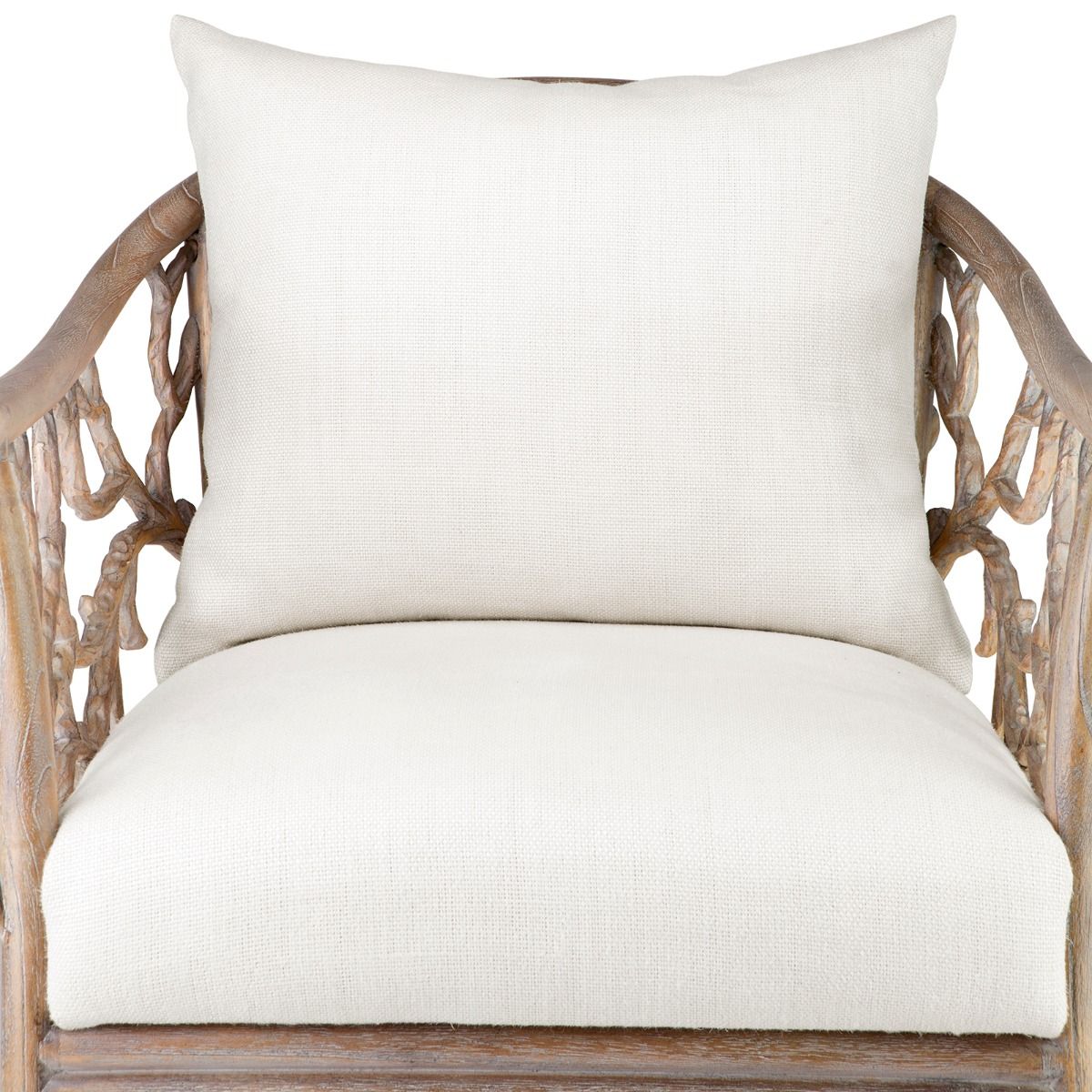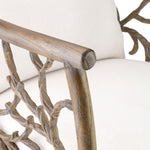 An updated expression of classic French faux bois design, in which natural tree-like features are brought to hyperrealistic realization, our armchair features a hand-carved silhouette of solid Cape Lilac Mahogany, intricately crafted to resemble a magical swirl of twigs. The rustic elements are refined by a light driftwood finish and plush linen cushions.