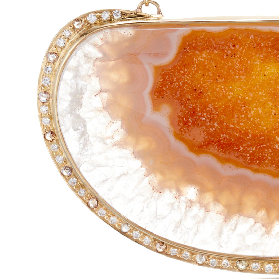 A spellbinding pendant necklace showcases a druzy quartz centerpiece, its natural texture splendidly contrasted with the refined sparkle of cognac and white diamonds.