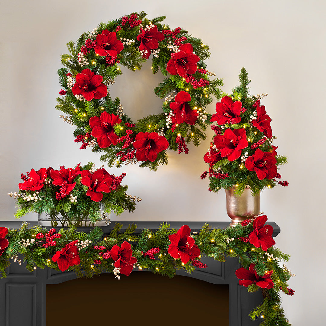 Deck the halls, doorway or stairway railings with our pre-lit holiday faux floral collection featuring an abundance of glittered amaryllis, pines leaves, and red and silver berries. A majestic and festive statement throughout the season, this tabletop tree can be enjoyed year after year — and still look just as fresh. The making of artificial flowers is an ancient art that originated in China's Tang Dynasty more than 1,300 years ago. Bountiful arrangements of color and texture, our exquisite greenery is meticulously shaped and painted by hand to perfectly mimic nature’s beauty.
