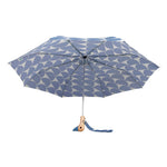Featuring a charming birchwood duck handle, this environmentally-friendly umbrella is handcrafted of PET fabric made from recycled plastic bottles. Small enough to fit in a tote bag and designed with an automatic open button for easy deployment, it's perfect for keeping you dry on the rainiest of days. High-strength steel and aluminum frame. Includes matching slip case and wrist strap.