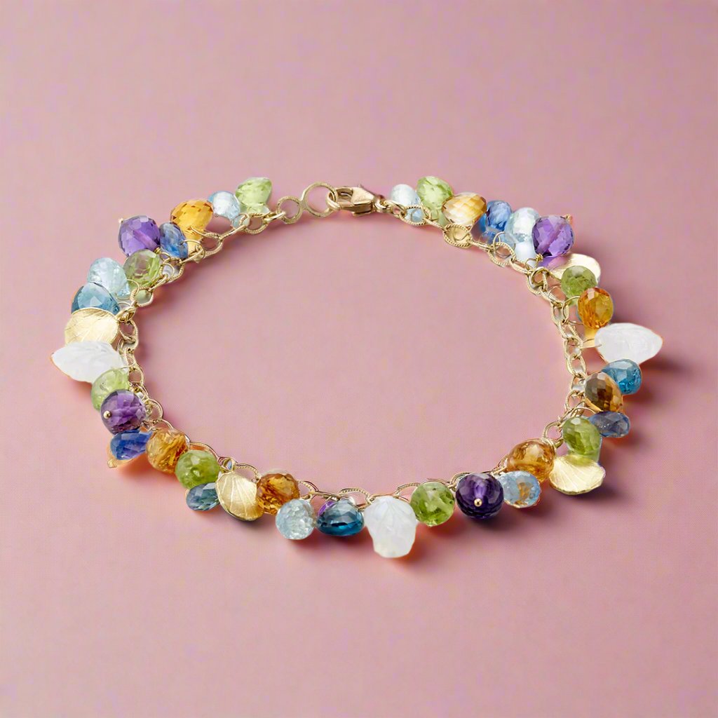 Briolettes of peridots, citrine, amethyst, aquamarine, kyanite, London blue topaz and three carved leaf moonstones dangle from this dazzling link bracelet.