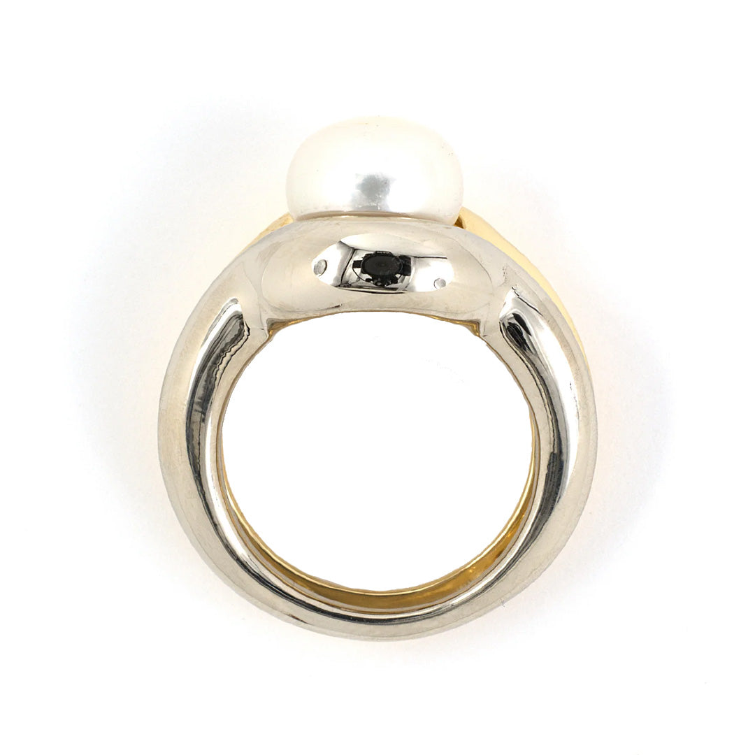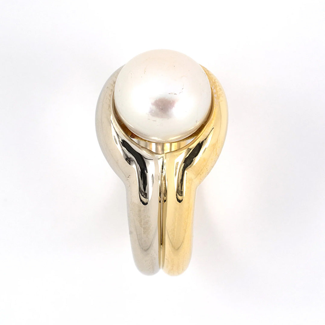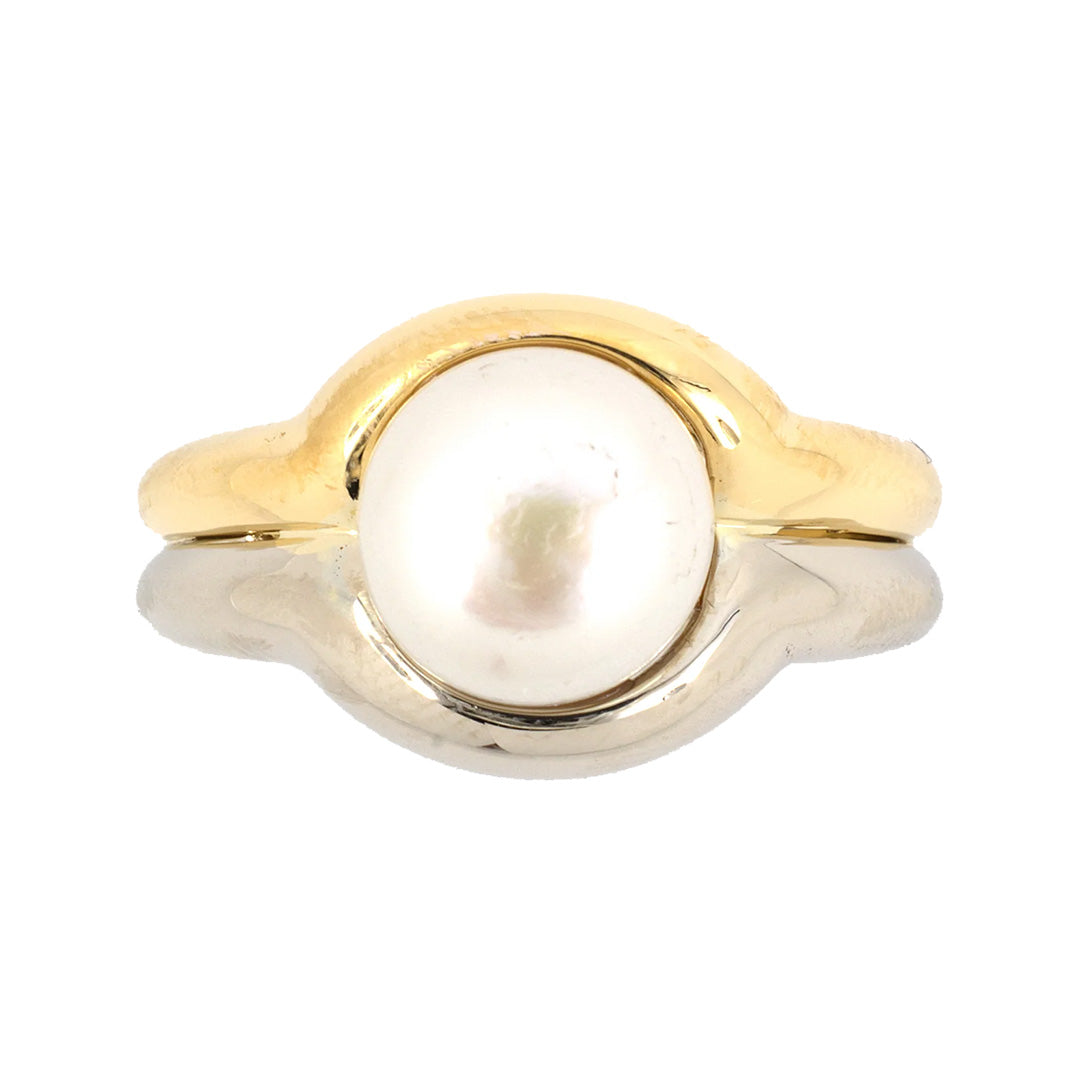 A modern study in contrast, this Elan ring unites yellow and white gold in a fluid design centered by a luminous pearl. Its sculptural setting highlights the gem’s natural radiance with contemporary elegance.