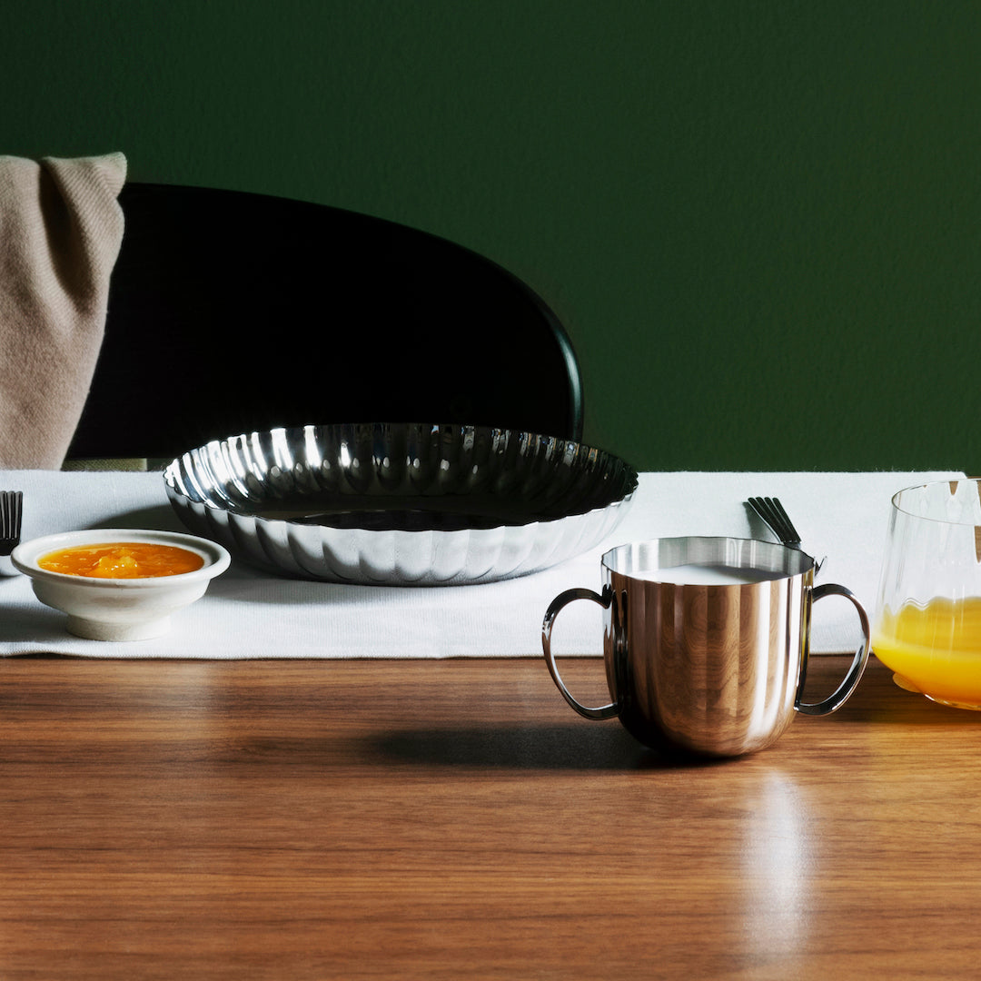 Celebrate a child's birth or christening with this stainless-steel deep plate and matching cup. Bearing the distinctive Deco grooves inspired by original Sigvard Bernadotte pieces, the set is sure to become a much-loved family heirloom. Swedish prince Sigvard Bernadotte was Georg Jensen's very first design star. His innovative work displays a love of craftsmanship mixed with a modernist aesthetic and he was credited with starting the house's move from decorative Art Nouveau into a more functionalist, Scandinavian style. His iconic pieces have become the inspiration for the Bernadotte collection.