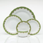 Made of white porcelain and handpainted by master artisans in Hungary, this elegant plate is bordered in green and 24-karat yellow gold. Herend’s porcelain creations feature a signature pattern that dates back to 1858, when a fish-scale decoration inspired a craftsman to create a similar design imitating feathers. 10 1/2" diam.