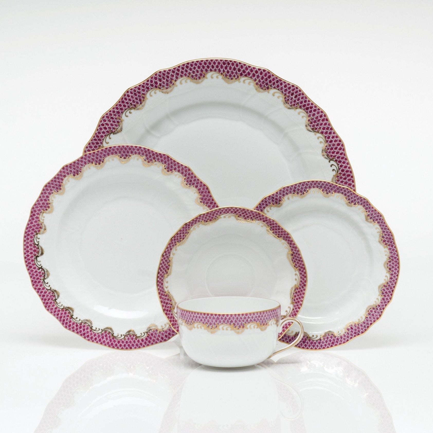Made of white porcelain and handpainted by master artisans in Hungary, this elegant plate is bordered in raspberry and 24-karat yellow gold. Herend’s porcelain creations feature a signature pattern that dates back to 1858, when a fish-scale decoration inspired a craftsman to create a similar design imitating feathers. 10 1/2" diam.
