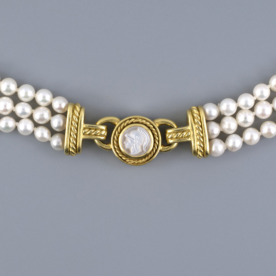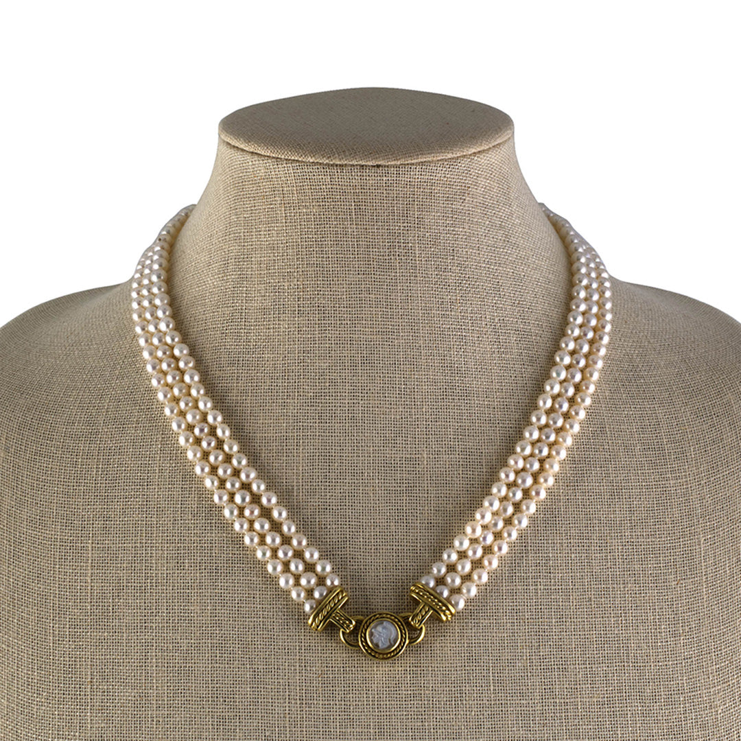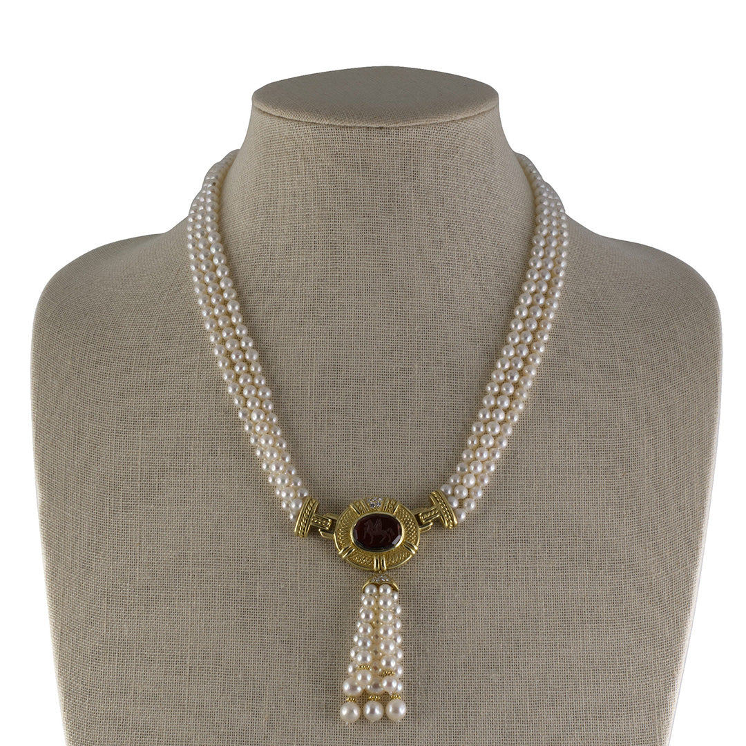 A striking fusion of classical influence and contemporary design, this Judith Ripka creation showcases a removable garnet intaglio with diamond accents and a pearl tassel drop on a 3-strand pearl torsade necklace. A mother-of-pearl intaglio clasp is also included in order to wear the pearl necklace alone. Gump’s is forever treasure hunting for the best of everything and our collection of estate jewelry — featuring rare antique pieces — is no exception. Distinguished in provenance, each item is one of a kind, reflecting its distinctive gemstones, materials and craftsmanship.