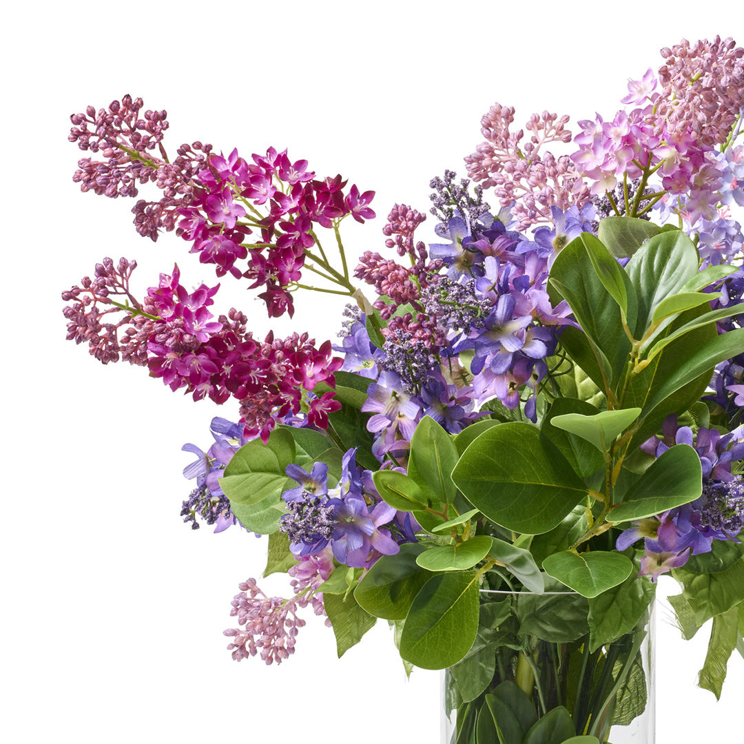 A study in height and harmony, this lush arrangement layers lilac in painterly gradients — from deep plum to soft blush — with sculptural greens and a glass vessel filled with river stones. The making of artificial flowers is an ancient art that originated in China's Tang Dynasty more than 1,300 years ago. Bountiful arrangements of color and texture, our exquisite greenery is meticulously shaped and painted by hand to perfectly mimic nature’s beauty.