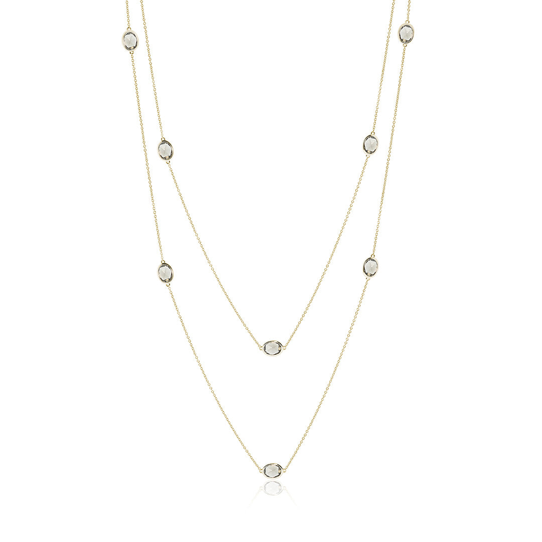 Set along a fine gold chain, bezel-set smokey quartz stations offer airy elegance and gentle shimmer in this versatile layering piece.