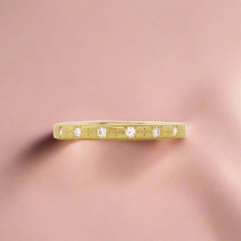 Simple yet elegant, this enchanting wedding band features a pattern that alternates diamonds and hand-etched details. The subtle satin finish on the yellow gold allows the gemstones to shine and highlights the beauty of the piece's craftsmanship.