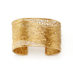 Rows of finely textured gold curve in a gentle sweep, edged by bands of rose-cut and accented with scattered brilliant diamonds. The cuff’s sculptural design evokes the rhythm of flowing water, merging texture and sparkle in a dramatic statement piece.