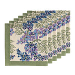 Hand-blocked in India using time-honored techniques, these cotton napkins bring the romance of cascading wisteria vines to your spring table. Shades of violet, periwinkle and fresh green are framed by a verdant border, offering a painterly backdrop for both casual garden lunches and evening celebrations.